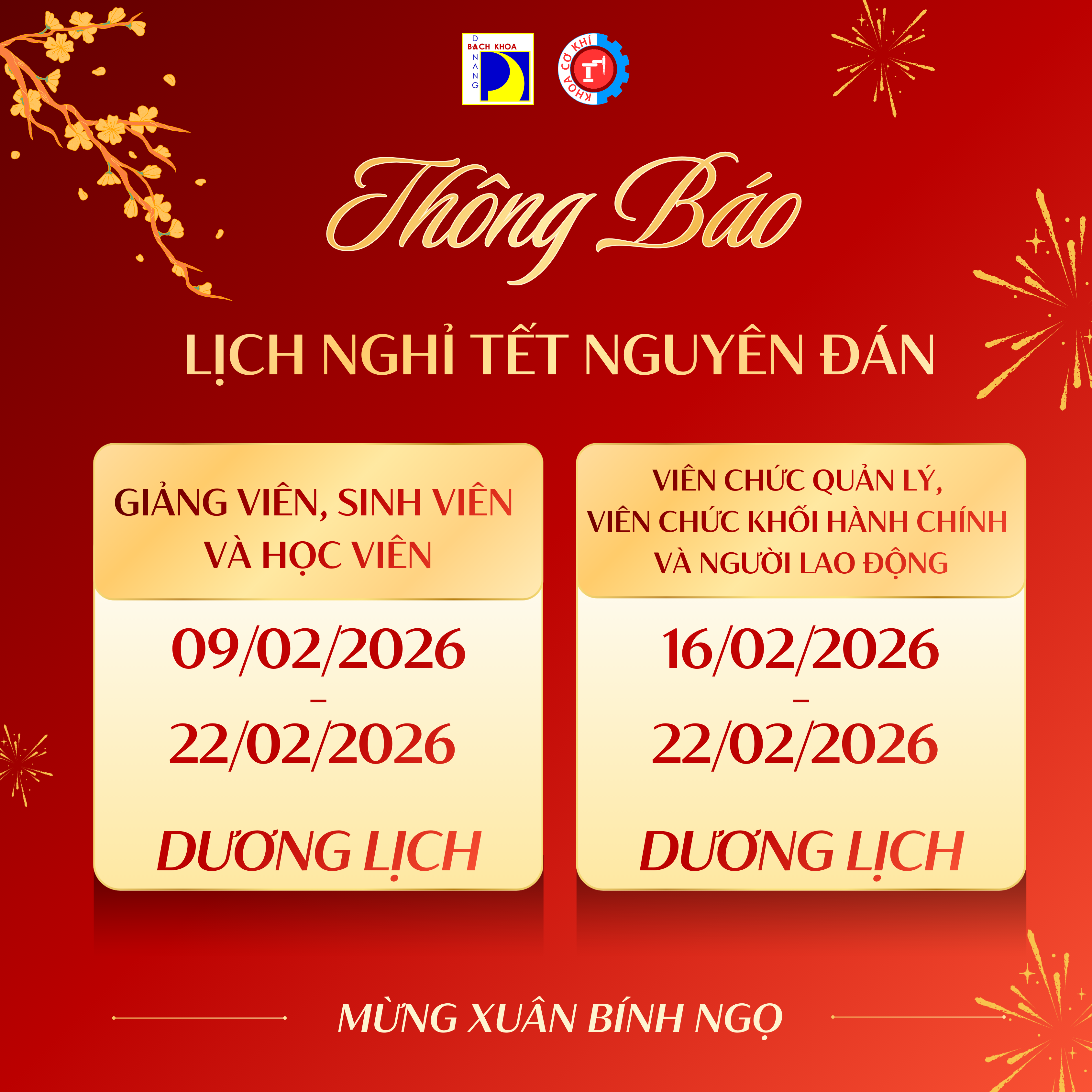 Khoa Cơ khí, Trường Đại học Bách khoa, Đại học Đà Nẵng trân trọng thông báo thời gian nghỉ Tết Nguyên đán năm 2026 như sau: