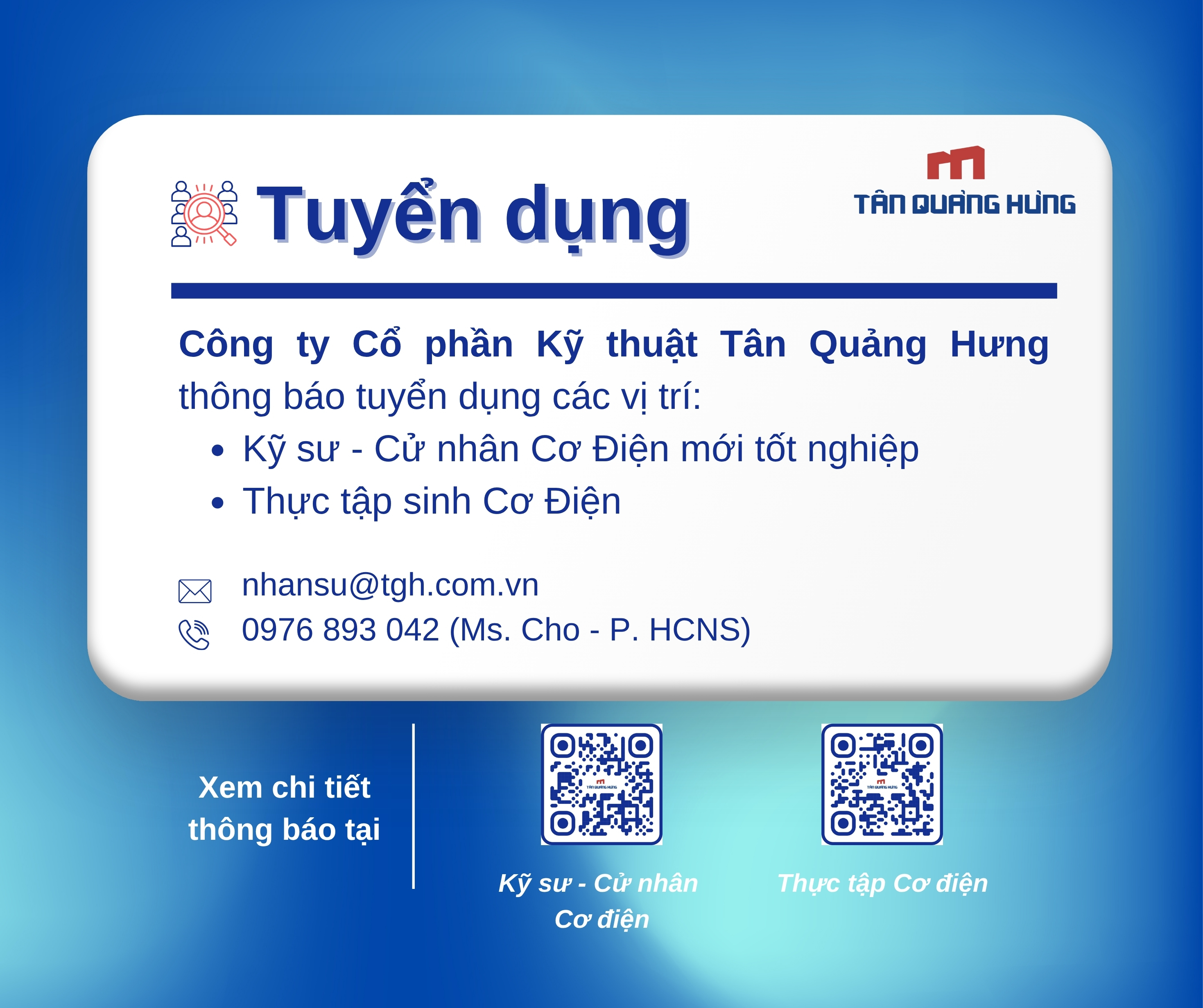 Công ty Cổ phần Kỹ thuật Tân Quảng Hưng thông báo tuyển dụng các vị trí Kỹ sư - Cử nhân và Thực tập sinh Cơ Điện.